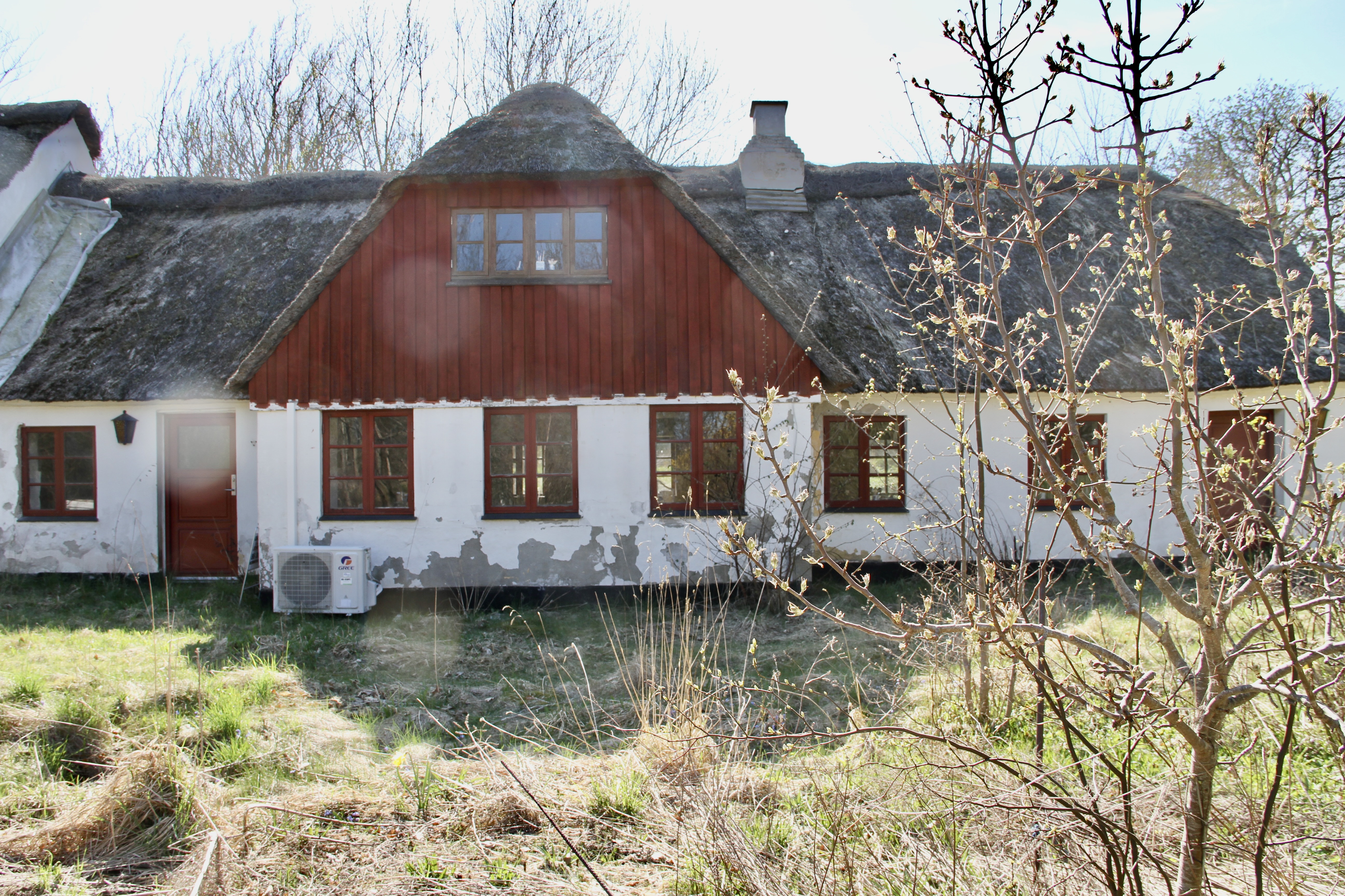 Ydervæggene fremstår pudset og kalket med store afskalninger og skader. Taget er stråtag, som ligeledes er stærkt nedbrudt og ikke længere brugbart. Et kig ind i bygningen viser store synlige skader af nedbrudte lofter med mange konstruktive skader.